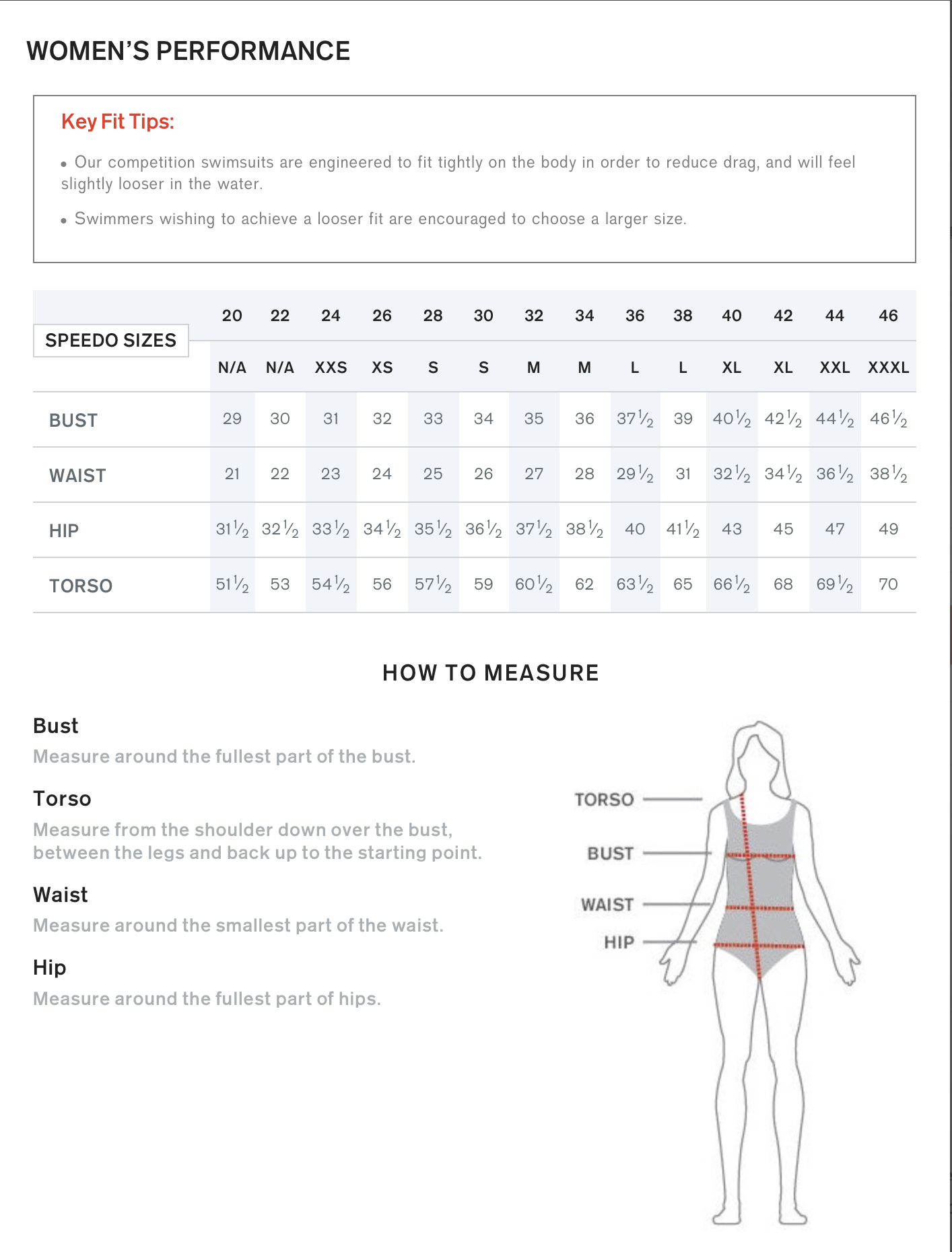 • Sizing: Speedo’s competition swimsuits are engineered to fit tightly on the body in order to reduce drag, and will feel slightly looser in the water. Swimmers wishing to achieve a looser fit are encouraged to choose a larger size.